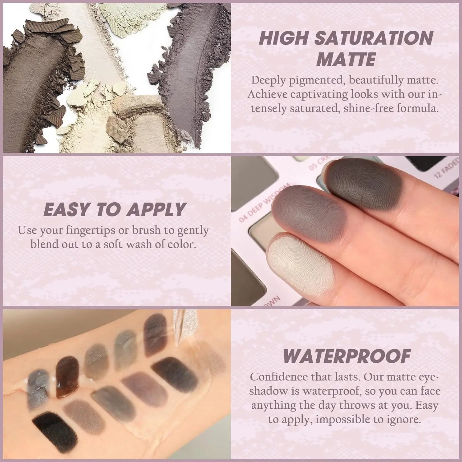 Scopri l’eleganza senza tempo con la palette Afflano All Matte da 12 colori. Tonalità neutre come grigi freddi, taupe e morbidi mauve si fondono in sfumature perfette per look naturali da giorno o occhi scolpiti e sofisticati da sera. La texture vellutata, altamente pigmentata e facile da sfumare permette di creare risultati professionali senza sforzo. Vegana, cruelty-free e a lunga tenuta, è la palette ideale per chi ama la bellezza discreta ma impeccabile.