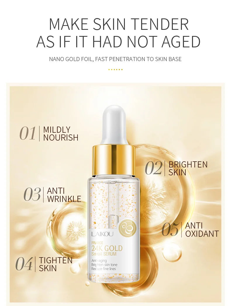 24k Gold Serum: arricchito con foglie d’oro 24k, illumina la pelle, dona un glow naturale e aiuta a ridurre linee sottili e segni di stanchezza.